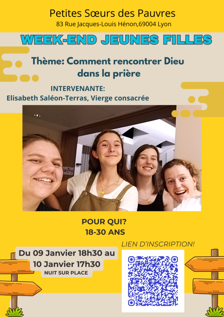 Comment rencontrer Dieu dans la prière ? Les Petites Soeurs des Pauvres t’invitent à une journée de spiritualité sur le thème : « Comment rencontrer Dieu dans la prière ? » avec l’intervention de Elisabeth Saléon-Terras, Vierge consacrée, membre de la société de Jean-Marie Vianney. Du vendredi 09 Janvier 18h30 au samedi 10 Janvier 17h30. Les Petites …